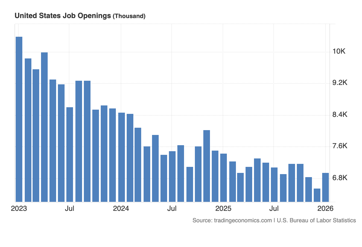 A gennaio, le aperture di lavori JOLTS sono state 6,946 milioni, sopra le previsioni Bloomberg a 6,75 milioni e le precedenti 6,55 milioni (rivisto da 6,542 milioni).