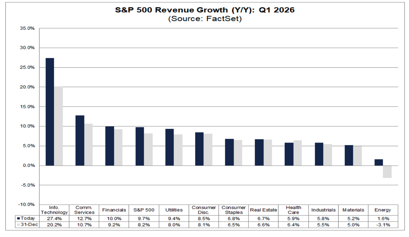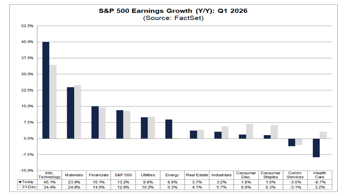 Secondo FactSet, per l’S&P 500 il 1° trimestre 2026 vedrà una crescita degli utili del 13,2% a/a, segnando il sesto trimestre consecutivo di crescita a doppia cifra. 9 degli 11 settori dell’indice dovrebbero riportare una crescita, in primis IT, materiali e finanziario.
