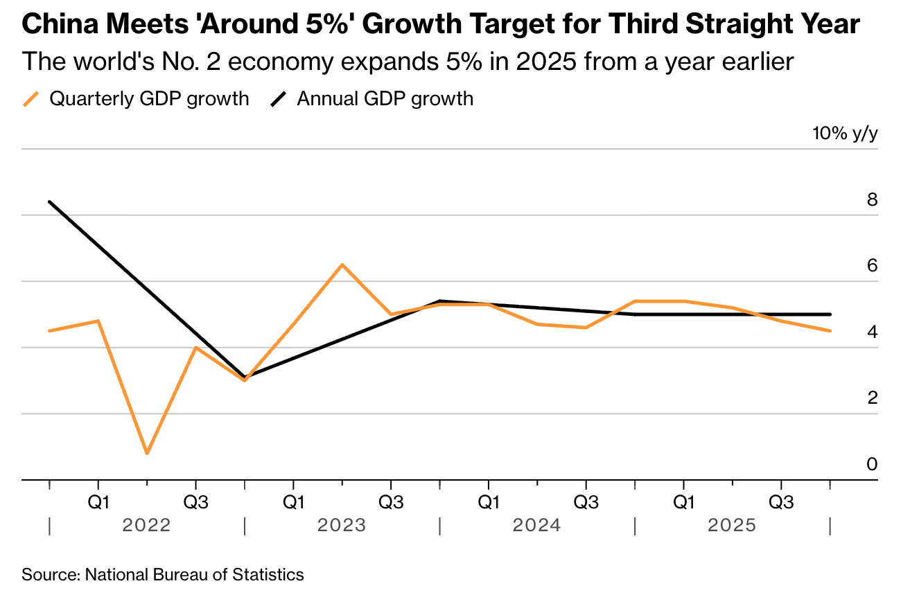 Nel 4° trimestre il PIL cinese si è attestato al 4,5%, in linea con le attese Bloomberg e il precedente 4,8%. Si tratta del ritmo più lento da fine 2022. Per l’intero anno, il Prodotto Interno Lordo è arrivato al 5%, confermando i target di crescita del Governo cinese.