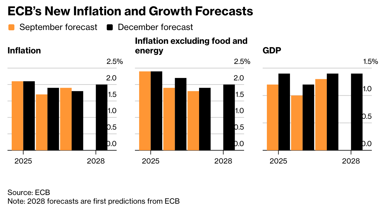 L’inflazione headline è vsta al 2,1% nel 2025, all’1,9% nel 2026, all’1,8% nel2027 e al 2% nel 2028 (da 2,1%, 1,7% e 1,9%).