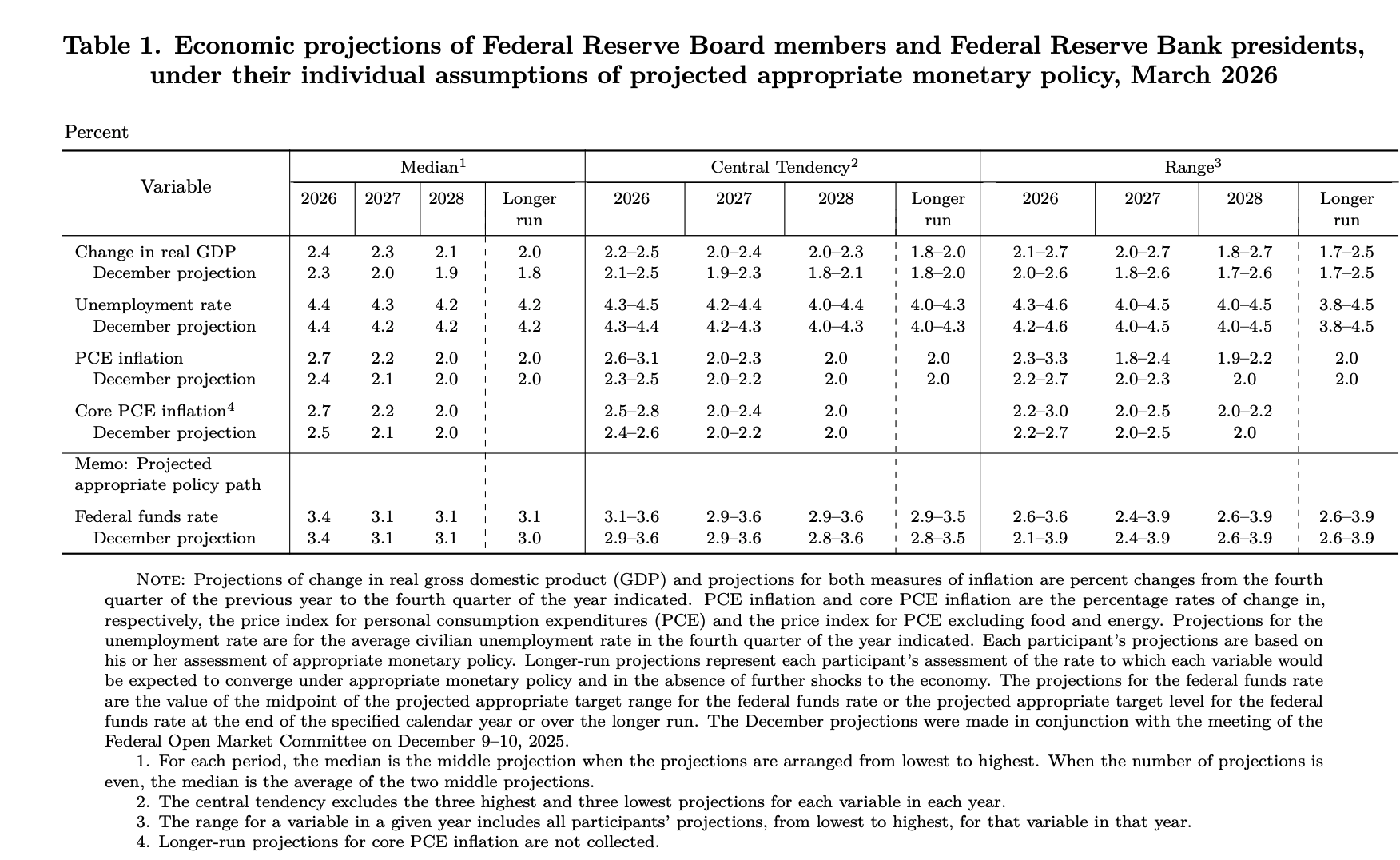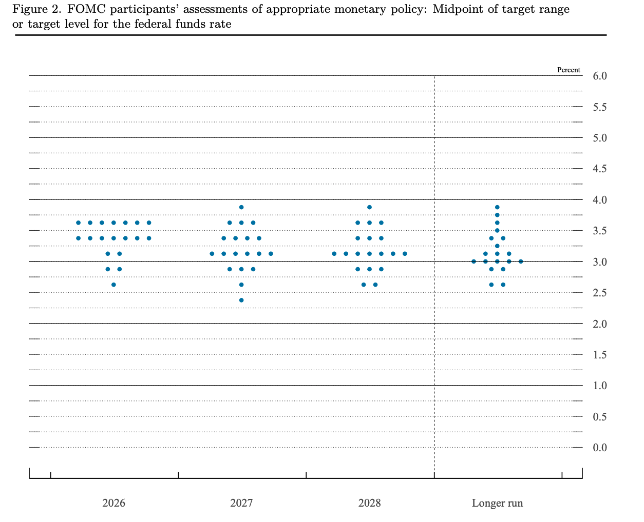 🔹La mediana sui tassi è invariata al 3,4% nel 2026 e al 3,1% nel 2027 e 2028. Le previsioni sul longer run sono passate dal 3% al 3,1%.