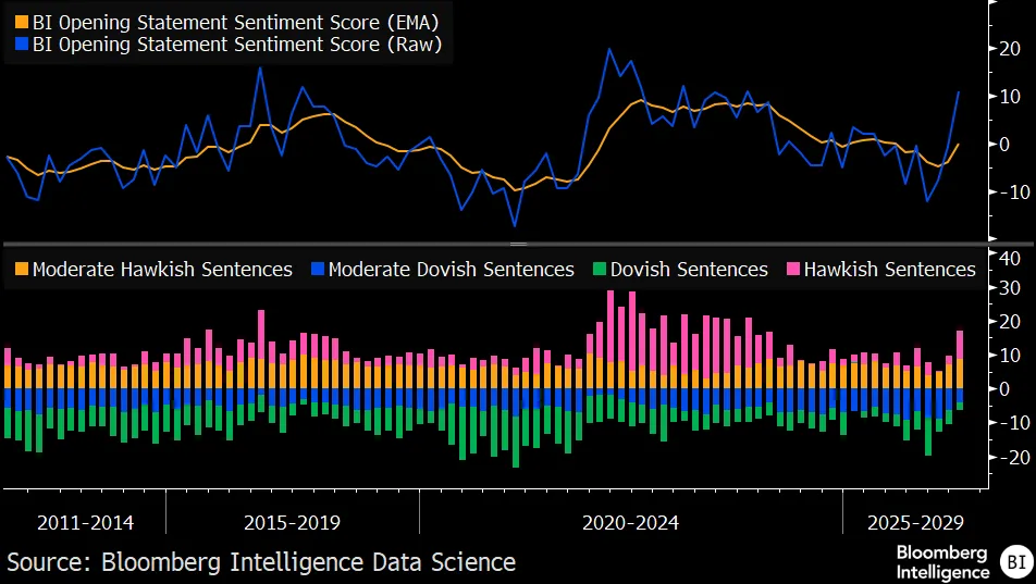 Secondo il Fed Sentiment Model sugli Opening Remarks di Bloomberg Intelligence, le osservazioni iniziali di Powell c’erano meno frasi dovish e più periodi hawkish.