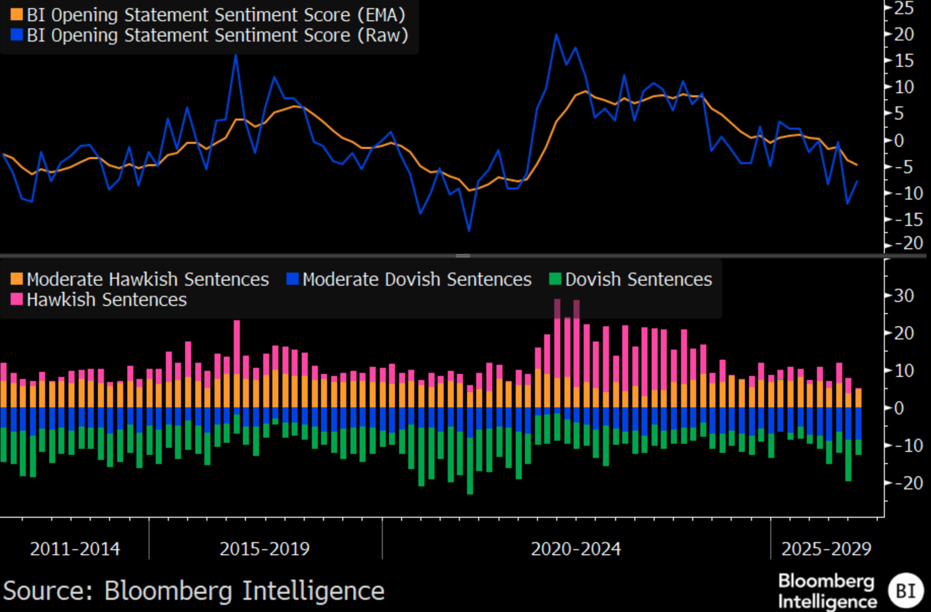 Secondo il Fed Sentiment Model sugli Opening Remarks di Bloomberg Intelligence, i commenti di apertura di Powell sono stati dovish, ma non come quelli della riunione precedente.