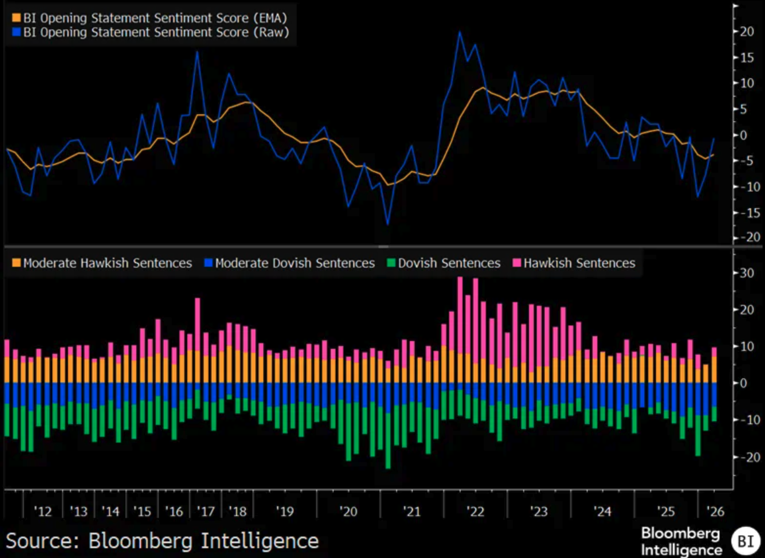 Secondo il Fed Sentiment Model sugli Opening Remarks di Bloomberg Intelligence, i commenti di apertura di Powell sono stati neutrali. Rispetto alle comunicazioni precedenti, ci sono stati più commenti hawkish e meno dovish.