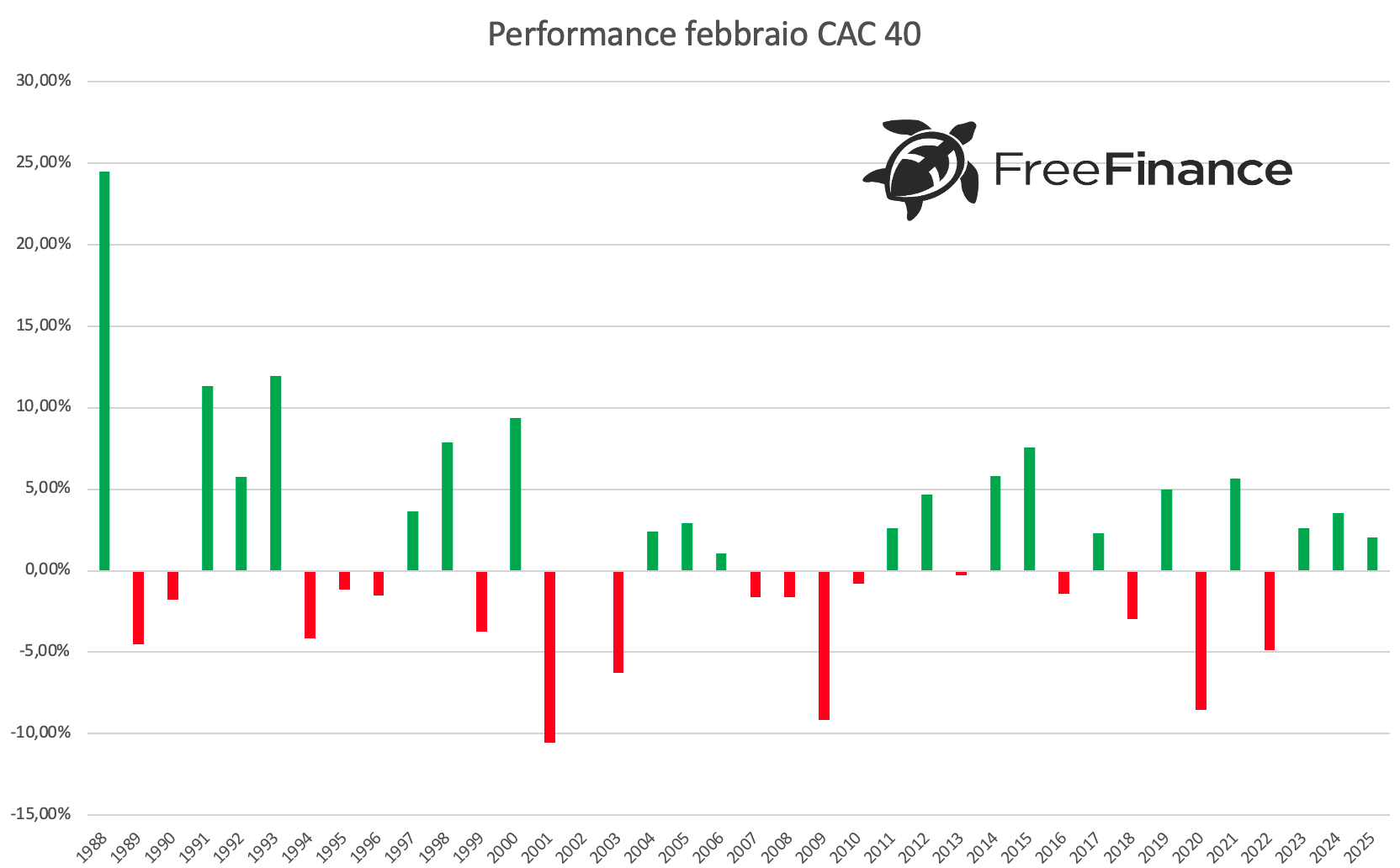 Infine, il CAC 40 ha chiuso febbraio sopra la pari nel 55,26% dei casi. La variazione media positiva è stata del +5,83%, quella negativa del -3,82% e quella generale del +1,52%.