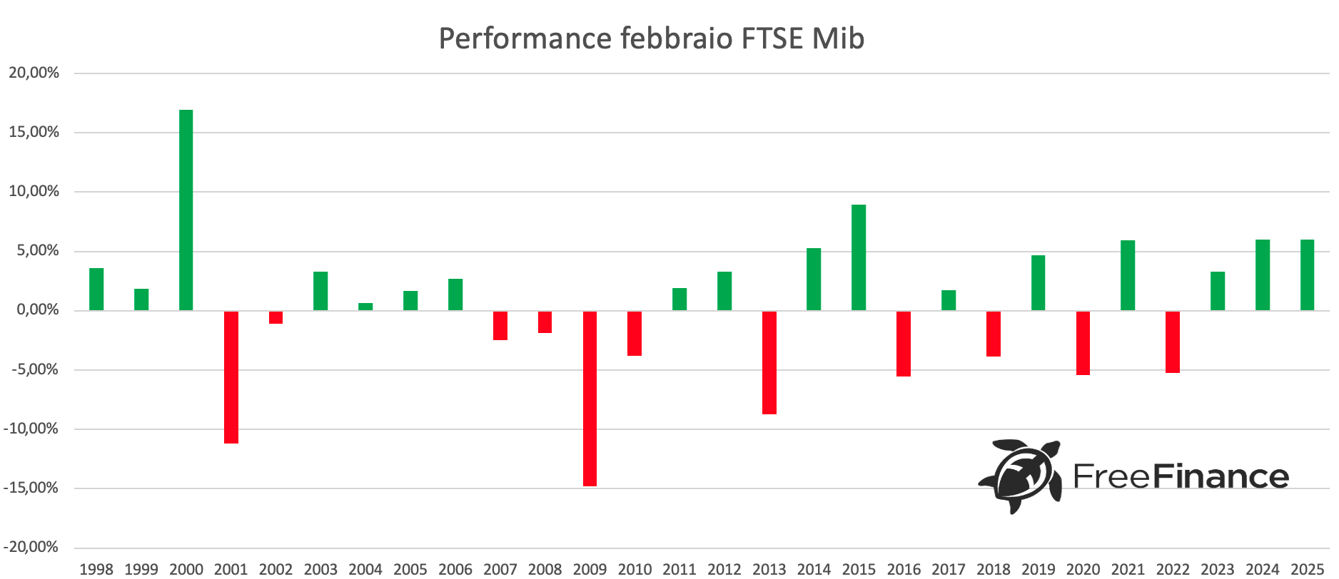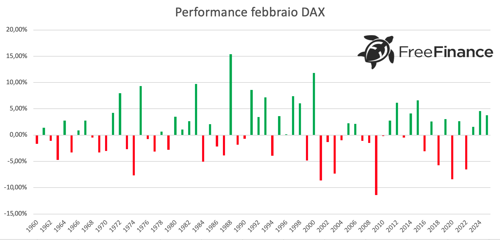 Per il DAX febbraio ha chiuso in positivo il 51,52% delle volte, con una variazione media del +0,62%. La performance positiva media è del +4,55%, mentre quella negativa del -3,55%.