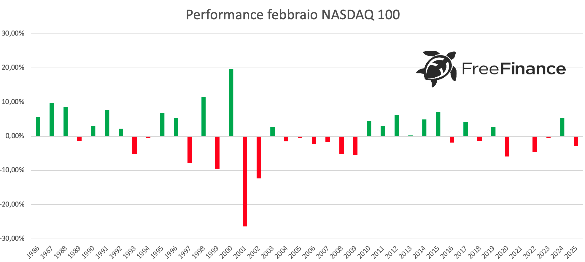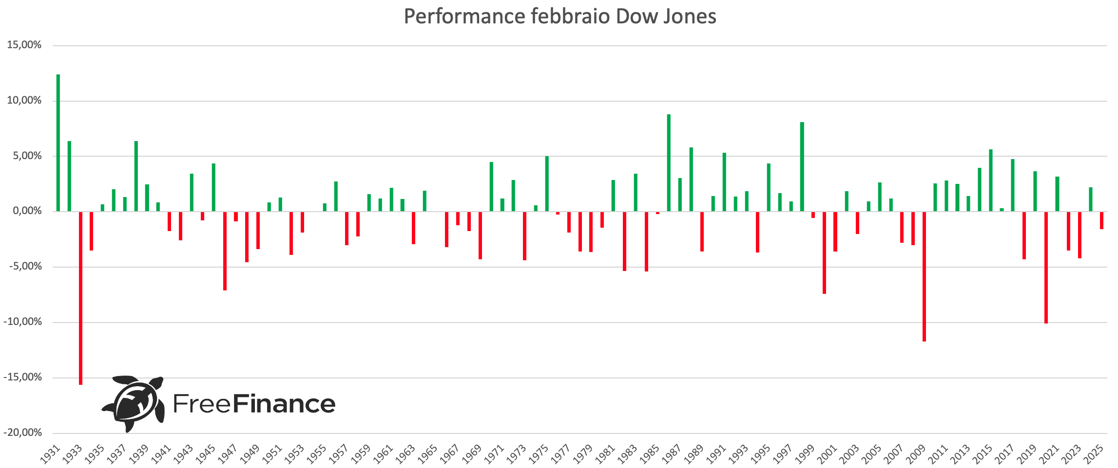 Per quanto riguarda il Dow Jones, la percentuale di febbraio chiusi in positivo è del 55,79%, con una performance media generale del +0,04%. La variazione media positiva è del +2,96%, mentre quella negativa del -3,64%.