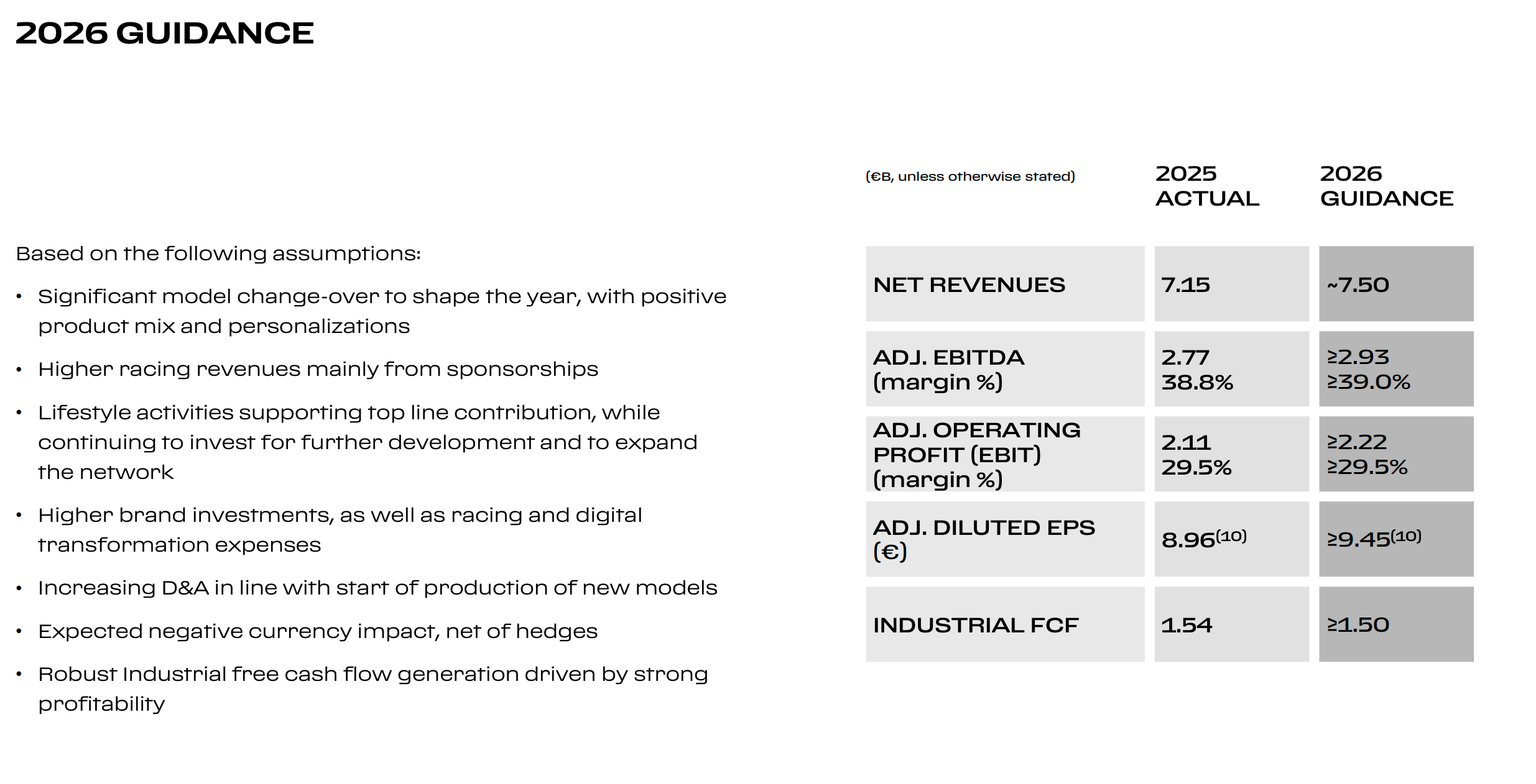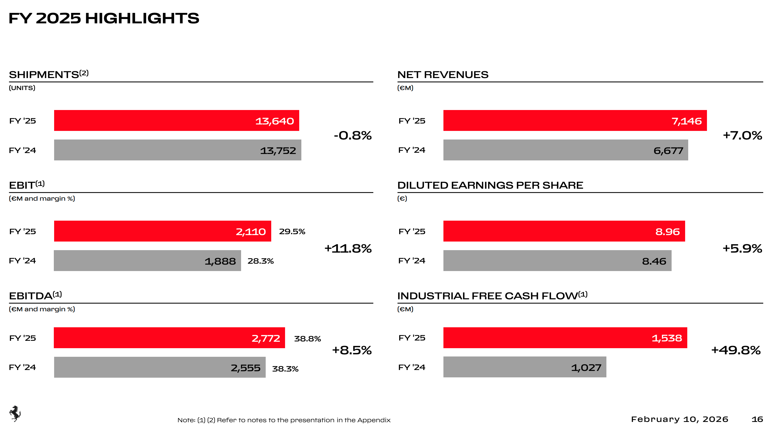 I risultati del 2025 confermano la solidità strutturale del modello e segnano un nuovo record di redditività. I ricavi netti hanno raggiunto 7,146 miliardo di euro, in crescita del 7% rispetto al 2024 (o +8% a cambi costanti), trainati da un aumento del 22,4% nei ricavi commerciali, di sponsorizzazione e di brand, oltre che da un incremento del 4,8% nelle vetture e nei ricambi. Sul fronte della redditività, il margine EBIT si è portato al 29,5% (+120 punti base anno su anno), il margine EBITDA al 38,8% con un EBITDA di 2,772 miliardi di euro (+8%), e l'utile netto ha raggiunto 1.600 milioni di euro (+5%).