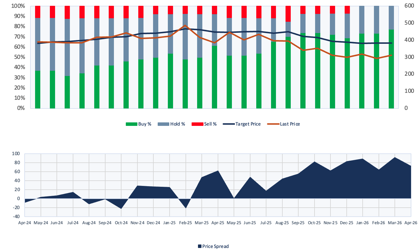 Stando a quanto riporta Bloomberg, dei 31 analisti censiti che seguono il titolo, 24 forniscono un giudizio buy, 7 di hold e 0 di sell. Il prezzo obiettivo a 12 mesi è ottimistico, a 383,58 euro, il 23% in più circa rispetto all’ultimo valore di 311,9 euro.
