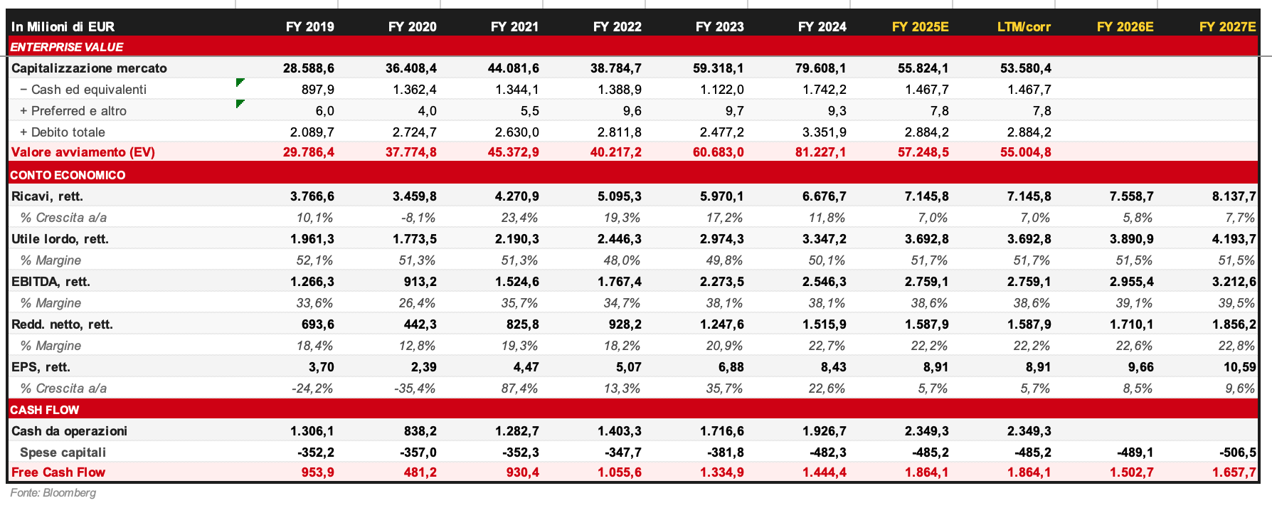Se guardiamo alle attese, Bloomberg vede ricavi a 7,559 miliardi di euro nel 2026 e a 8,138 miliardi nel 2027. Gli EPS adjusted dovrebbero invece crescere a 9,66 e 10,59 euro, mentre l’EBITDA adjusted a 2,955 e 3,213 miliardi di euro.