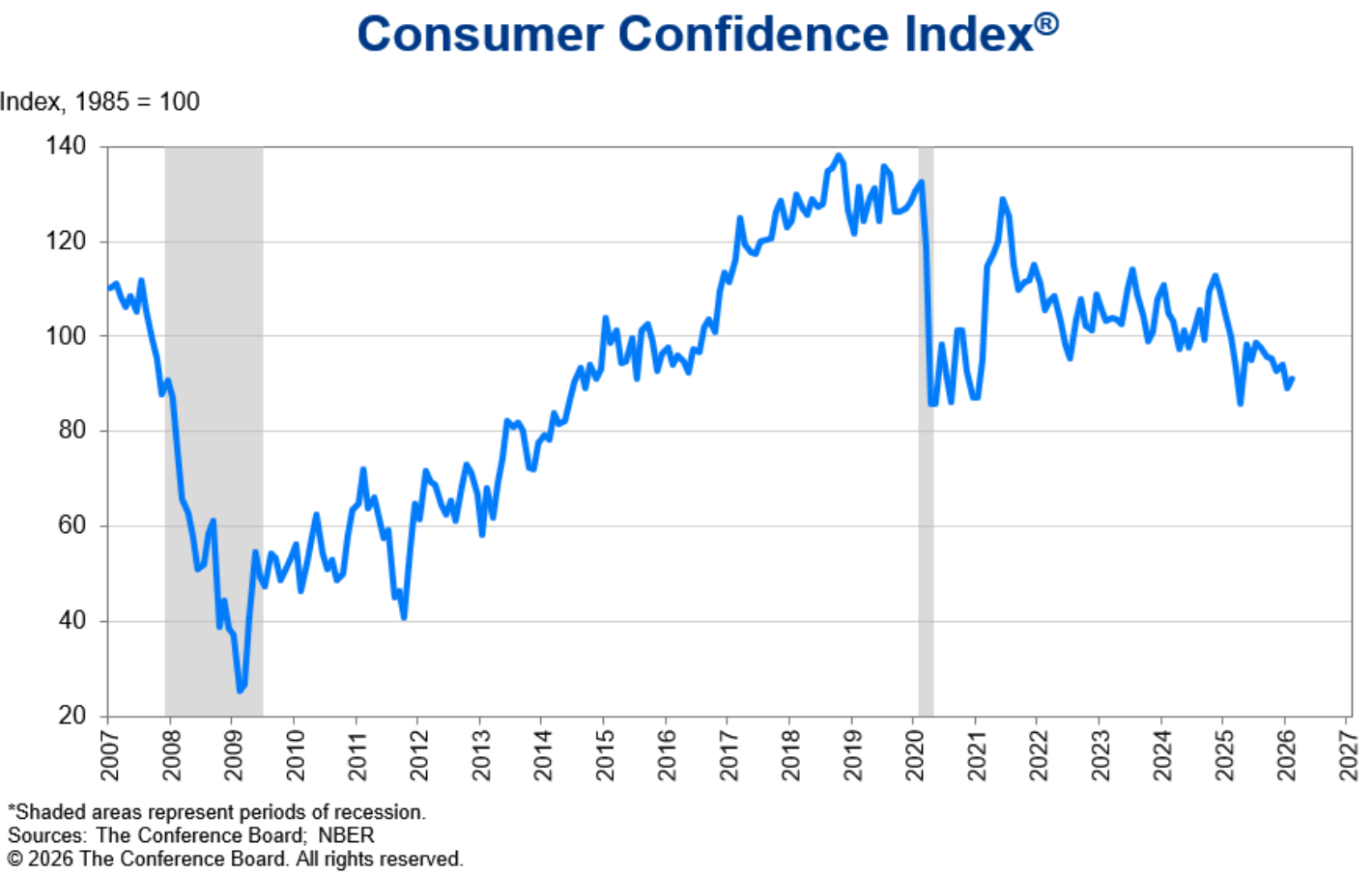 A febbraio, la fiducia dei consumatori elaborata dalla Conference Board si è attestata a 91,2 punti, sopra le attese Bloomberg a 87,1 punti e i precedenti 89 punti (rivisto da 84,5 punti). L’indice sulla situazione attuale è passato da 121,8 a 120 punti, mentre quello sulle aspettative da 67,2 a 72 punti.