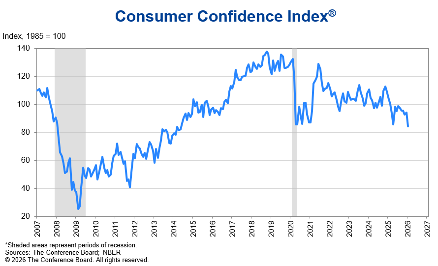 A gennaio, la fiducia dei consumatori elaborata dalla Conference Board si è attestata a 84,5 punti, sotto le attese Bloomberg a 91 punti e i precedenti 94,2 punti (rivisto da 89,1 punti).