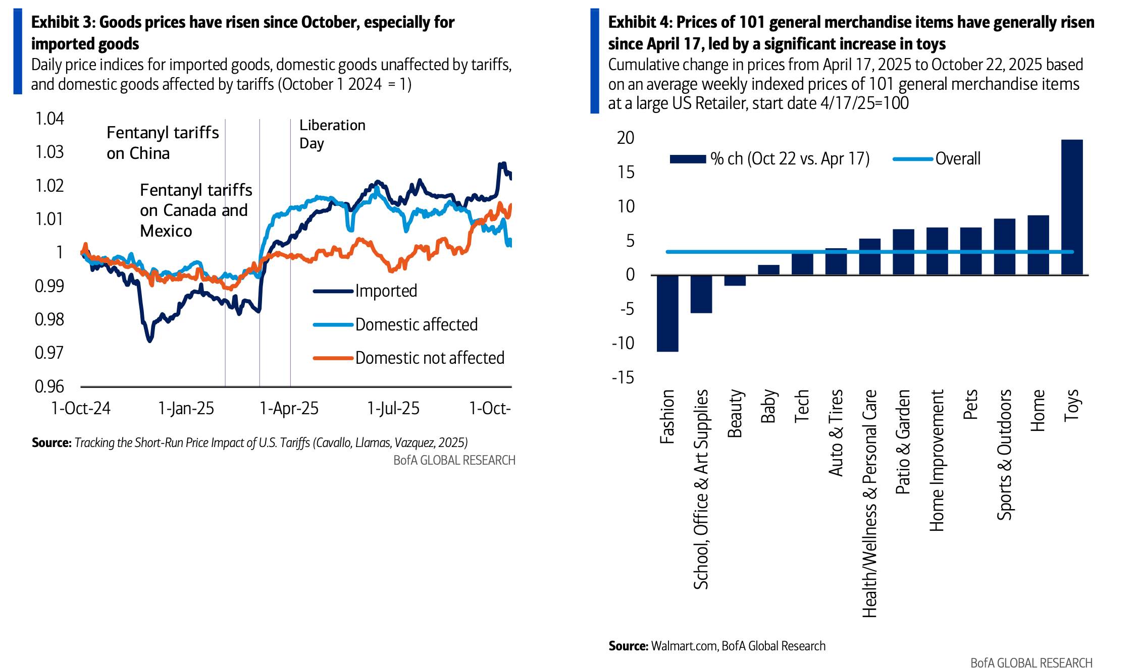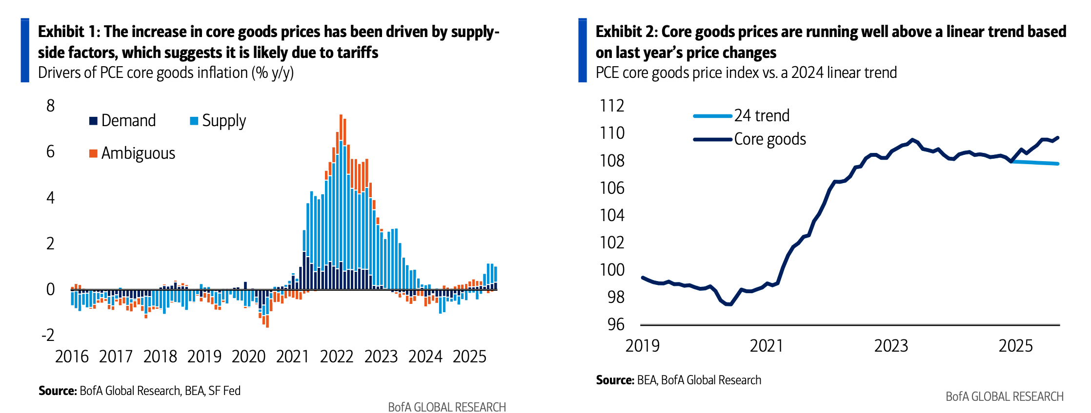 Secondo gli analisti di Bank of America, i dazi hanno fatto aumentare l’inflazione: sul PCE, l’impatto potrebbe essere stato di 30-50 punti base. Tuttavia, i consumatori non stanno pagando tutto il costo delle tariffe ma solo il 50%-70%. Con un passaggio completo, l’impatto stimato sarebbe di un incremento del PCE headline e core di 7 e 6 punti base per ogni aumento di 1 punto percentuale dell’aliquota tariffaria effettiva.