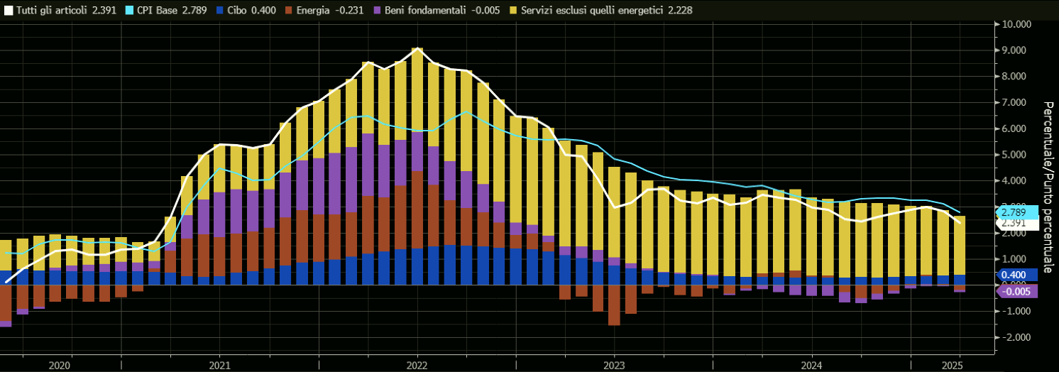 L’inflazione headline USA di marzo si è attestata al 2,4%, sotto le stime Bloomberg al 2,5% e il precedente 2,8%. Il dato core ha invece registrato il 2,8% a/a, anche in questo caso sotto il consensus al 3% e il 3,1% di febbraio.