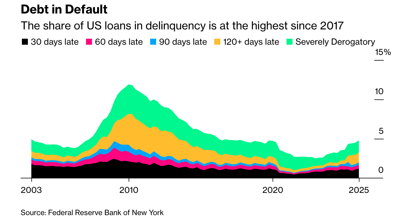 Nel 4° trimestre 2025, i tassi di insolvenza sui prestiti delle famiglie USA sono saliti al 4,8%: si tratta del valore più alto dal 2017. Secondo l’indagine svolta dalla Fed di New York, l’aumento delle insolvenze tra i redditi più bassi si aggiunge alle prove di un’economia a forma di K.