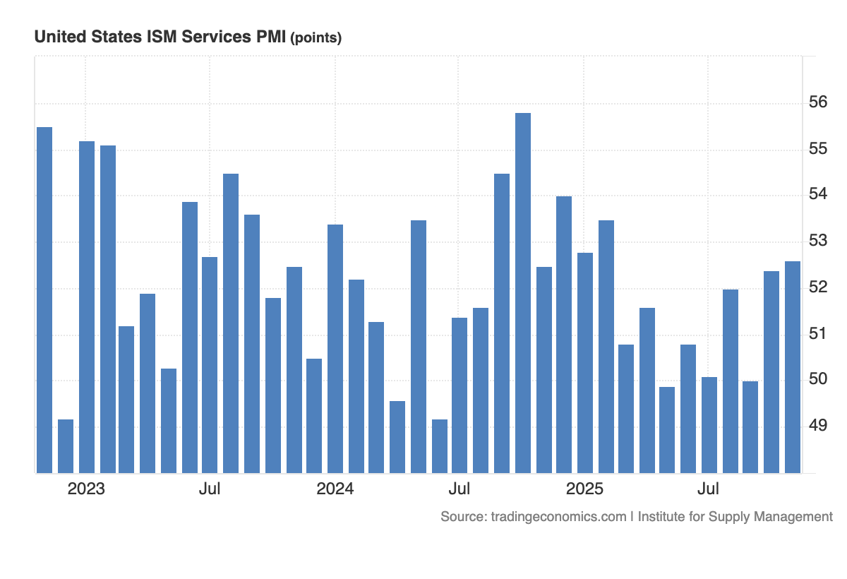 L’ISM dei servizi di novembre si è attestato a 52,6 punti, sopra le attese Bloomberg a 52 punti e i precedenti 52,4 punti. Il dato si trova ai massimi degli ultimi 9 mesi.