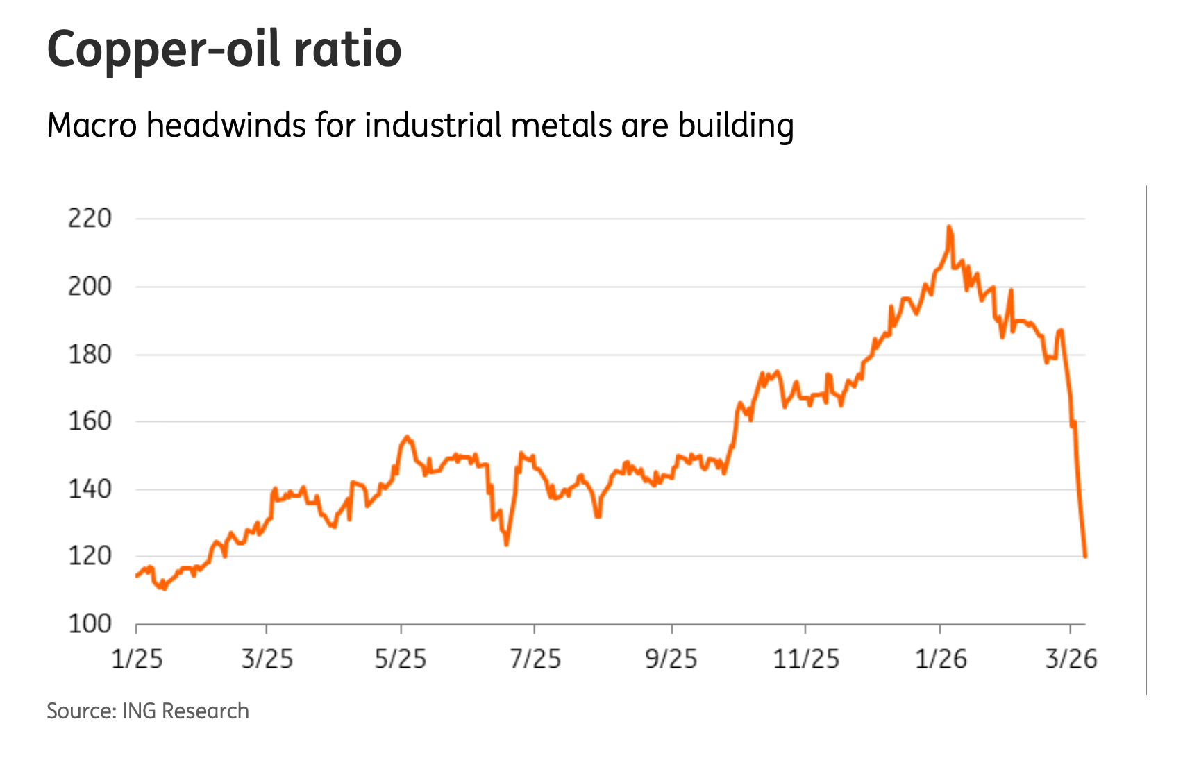 Interessante guardare anche al rapporto rame/petrolio, che è considerato un indicatore delle aspettative di crescita globale. Un calo prolungato di questo ratio indicherebbe un contesto macro più complesso, caratterizzato da aspettative di crescita più deboli che pesano sulla domanda di rame.