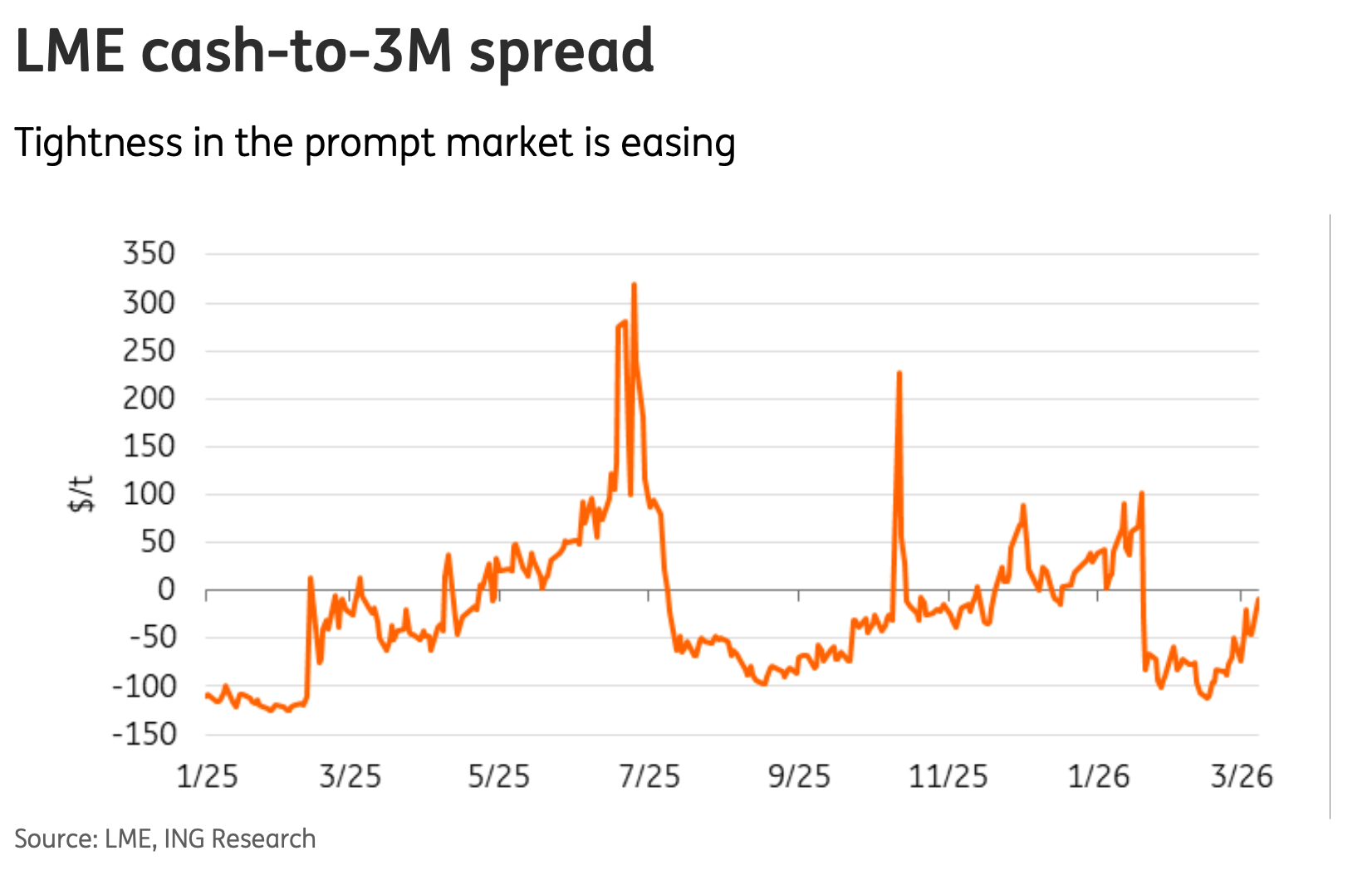 ING segnala anche che lo spread LME cash-to-3m si è avvicinato ai livelli neutri, suggerendo che la pressione sul mercato si è attenuata grazie al miglioramento della disponibilità a breve. Se lo spread entrasse in contango, ci sarebbero indicazioni di migliori condizioni di offerta.
