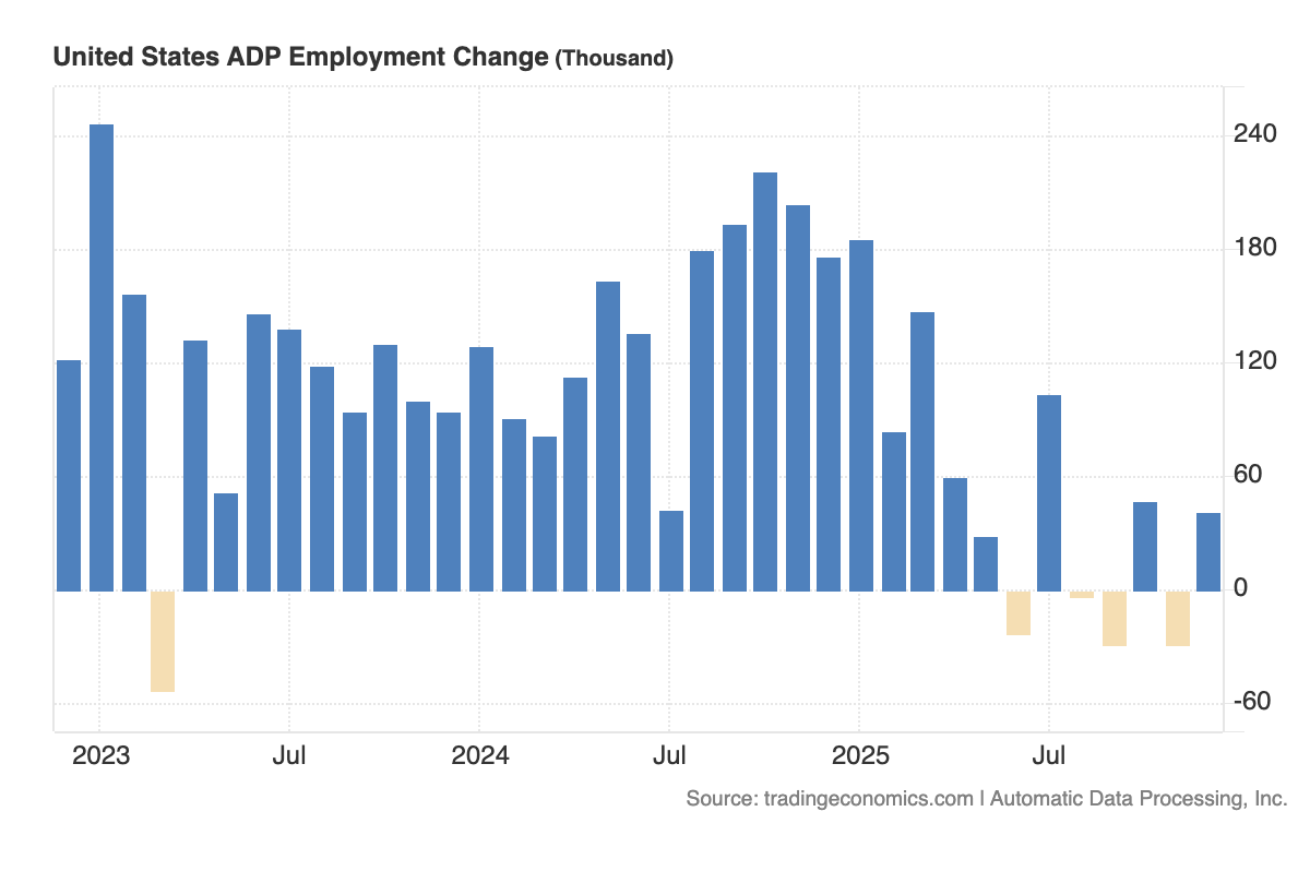 A dicembre, l’occupazione ADP è stata pari a 41mila unità, poco sotto le 50mila unità attese da Bloomberg e le precedenti -29mila (rivisto da -32mila).