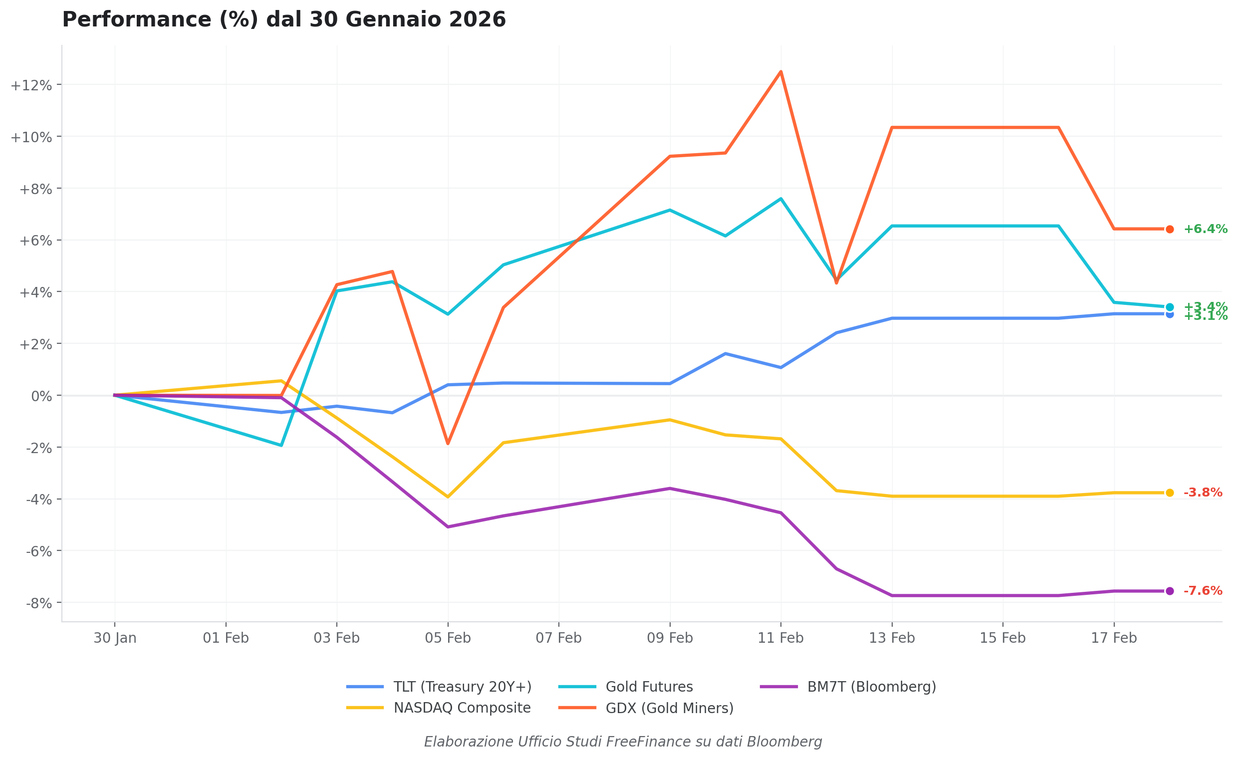 Ma guardate cosa succede da inizio febbraio, quando l’equity inizia a correggere: il NASDAQ perde il -3,8%, le Mag7 il -7,6%. L’oro tiene con un +3,4%, il GDX con un +6,4%. E il TLT (Treasury 20+ anni) registra un +3,1%, recuperando in poche settimane quasi il doppio di quanto ha realizzato in un anno intero.