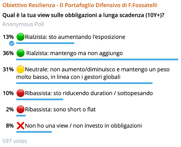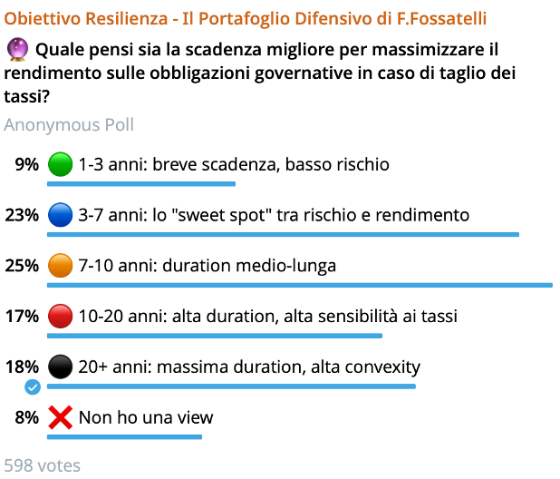 La difficoltà, ovviamente, è capire dove sarà il valore: sulla parte breve della curva? Sulla media? Sulla lunga? Le variabili in gioco sono molte: la traiettoria dei tassi, le aspettative di inflazione, il rischio fiscale, la duration ottimale in un contesto di rendimenti ancora elevati. Non c’è una risposta semplice, ed è proprio per questo che ho posto la domanda alla community nel canale Obiettivo Resilienza.