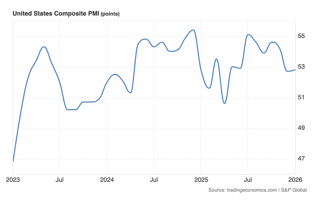 A gennaio, l’S&P Global PMI manifatturiero USA si è attestato a 51,9 punti, sotto i 52 punti attesi e i 51,8 punti precedenti. Il dato sui servizi è rimasto stabile a 52,5 punti, meno del consensus a 52,9 punti. La rilevazione composita è salita da 52,7 a 52,8 punti.