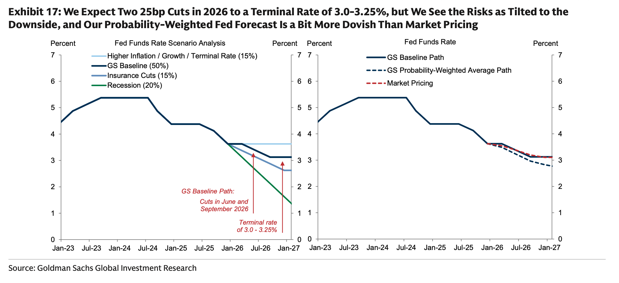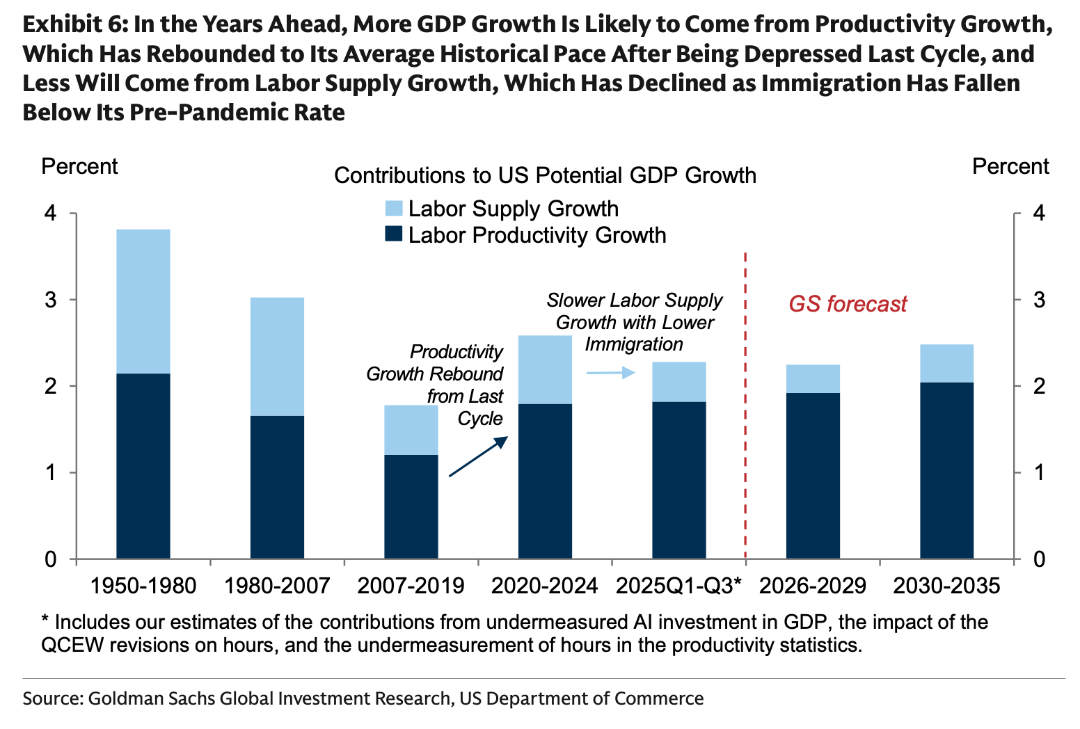 Ma cosa dovrebbe avvenire nel 2026? GS ritiene che il PIL potrebbe crescere del 2,8% su base annuale, grazie ai tagli fiscali che compenseranno l’effetto negativo dei dazi. La composizione del Prodotto Interno Lordo sarà diversa rispetto al passato. In particolare, una quota maggiore deriverà dalla produttività e una minore dall’offerta di manodopera. Le probabilità di recessione a 12 mesi sono scese dal 30% al 20%.