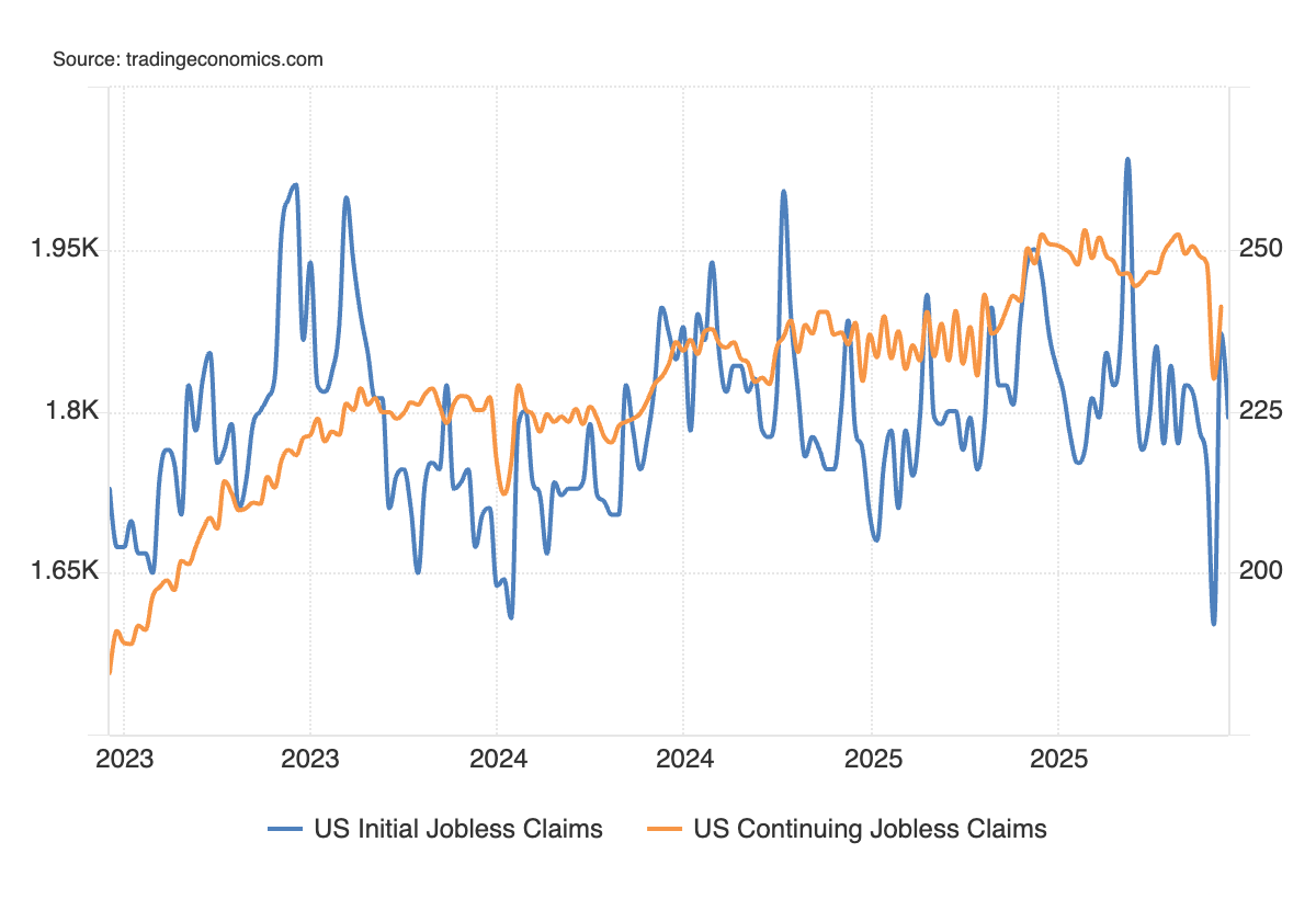 Nella settimana del 6 dicembre, le richieste continue sono passata da 1,83 milioni (rivisto da 1,838 milioni) a 1,897 milioni di unità, sotto il consensus a 1,92 milioni.