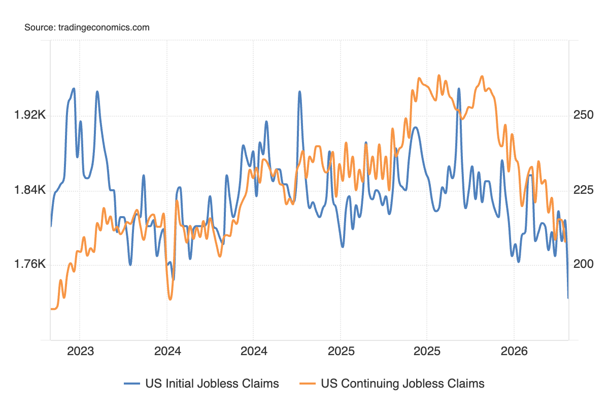 Nella settimana del 18 aprile, le richieste continue sono state 1,785 milioni, meno delle stime a 1,82 milioni e degli 1,808 milioni precedenti (rivisto da 1,821 milioni). La misurazione è scesa ai minimi degli ultimi 2 anni.