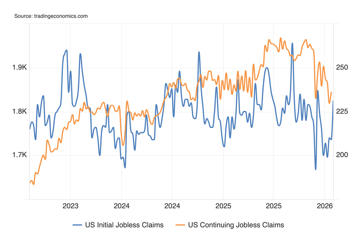 Nella settimana del 24 gennaio, le richieste continue sono state 1,844 milioni di unità, sotto il consensus a 1,85 milioni.