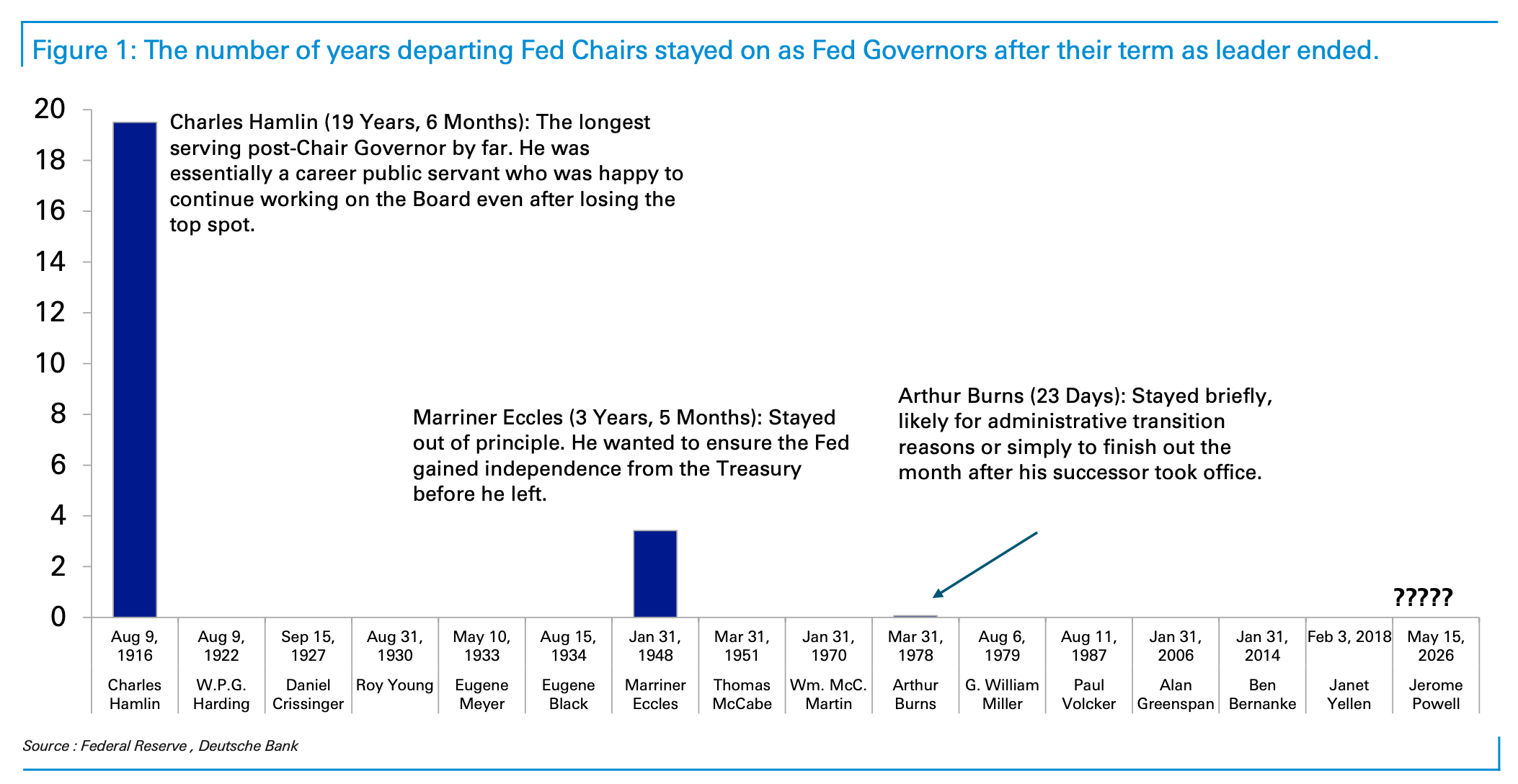 Ma cosa succederà a Powell, il cui mandato scadrà a maggio 2026? Gli analisti di Deutsche Bank evidenziano che, tradizionalmente, una volta scaduto il termine il Presidente della Fed lasci definitivamente la Banca centrale, anche se l’incarico da membro del Comitato dovesse durare altri anni. Tuttavia, la legge non prevede questo.
