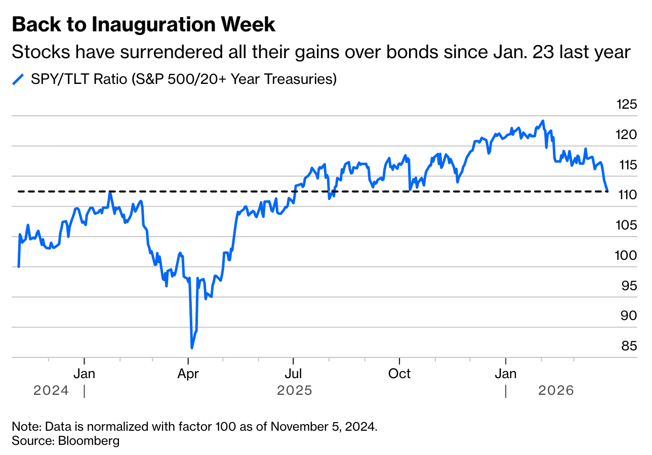 Fino alla scorsa settimana i bond si erano mossi in direzione opposta a quella attesa da un asset rifugio in contesto di guerra, la seduta di lunedì ha corretto l'anomalia. Il rapporto SPY/TLT riflette la nuova dinamica: il mercato azionario è tornato ai livelli della settimana inaugurale di gennaio 2025, azzerando oltre un anno di sovraperformance delle equity rispetto alle obbligazioni a lunga scadenza.