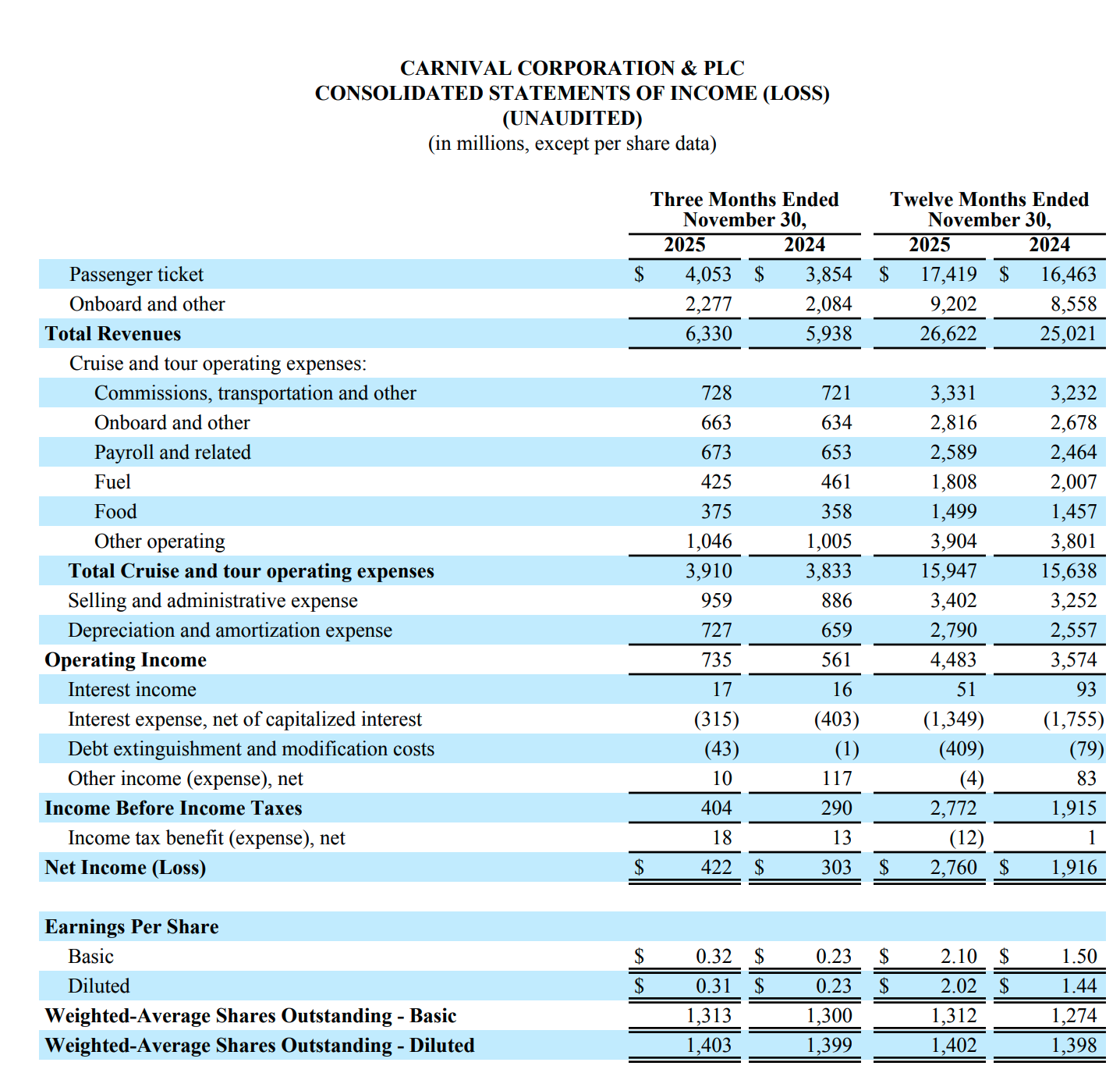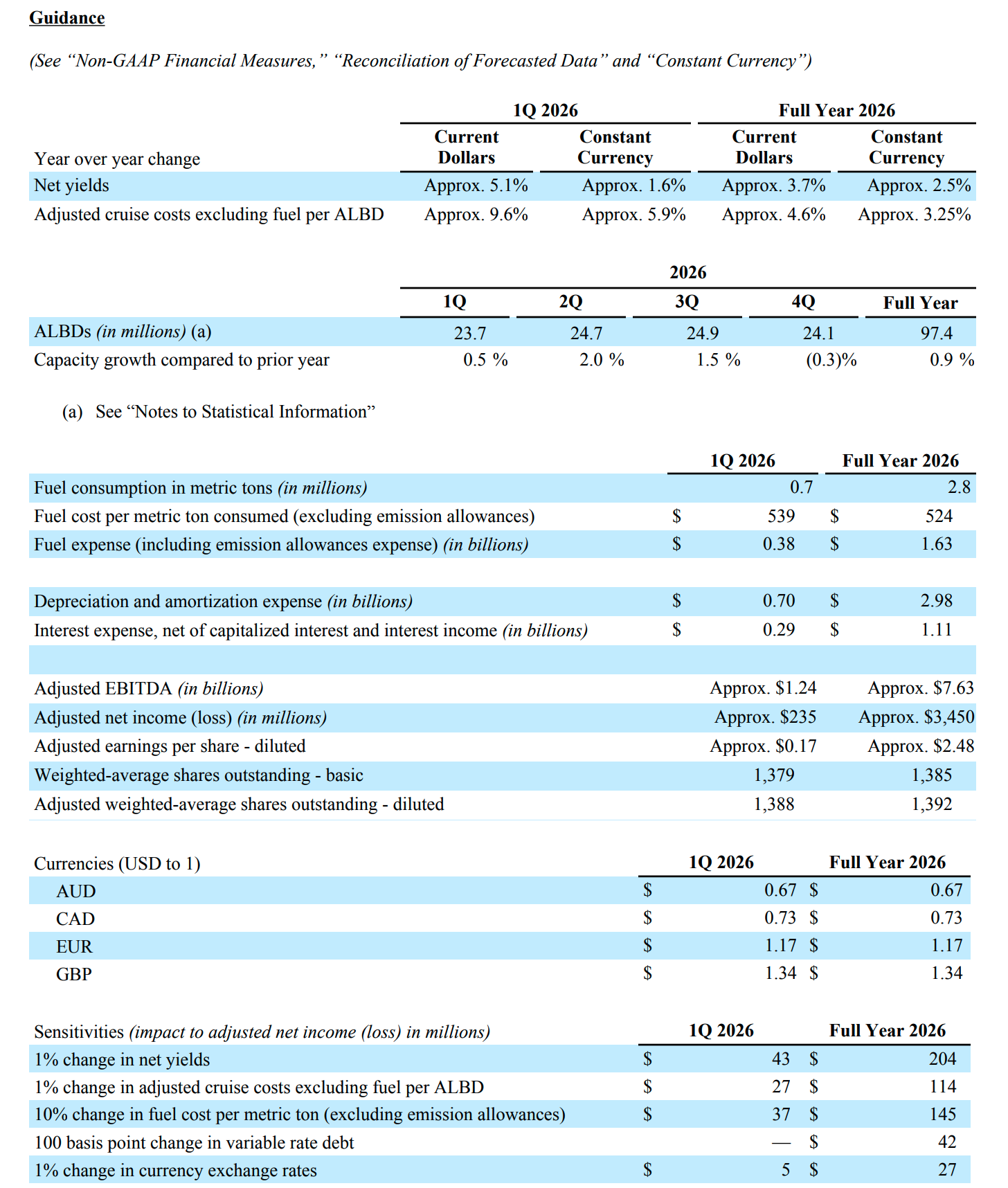 🔹Per il 2026, Carnival vede Net Yields in crescita del 3,7%, costi adjusted (carburante escluso) in aumento del 4,6%, EBITDA adjusted a circa 7,63 miliardi di dollari ed EPS adjusted a 2,48 dollari