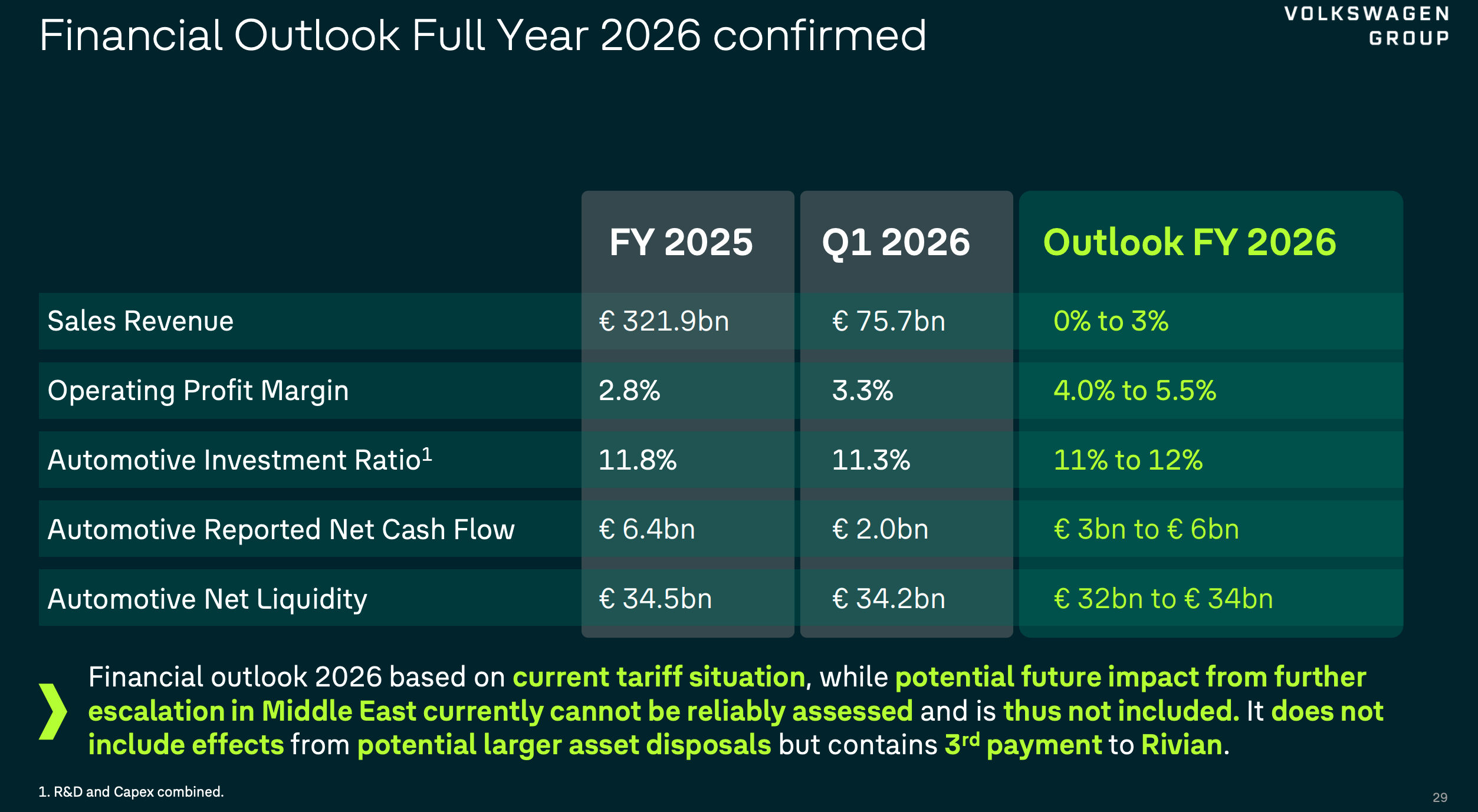 🔹La società ha confermato l’outlook 2026, prevedendo ricavi in crescita tra lo 0% e il 3%, un margine di profitto operativo tra il 4% e il 5,5% e una liquidità del segmento automotive tra 32 e 34 miliardi di dollari