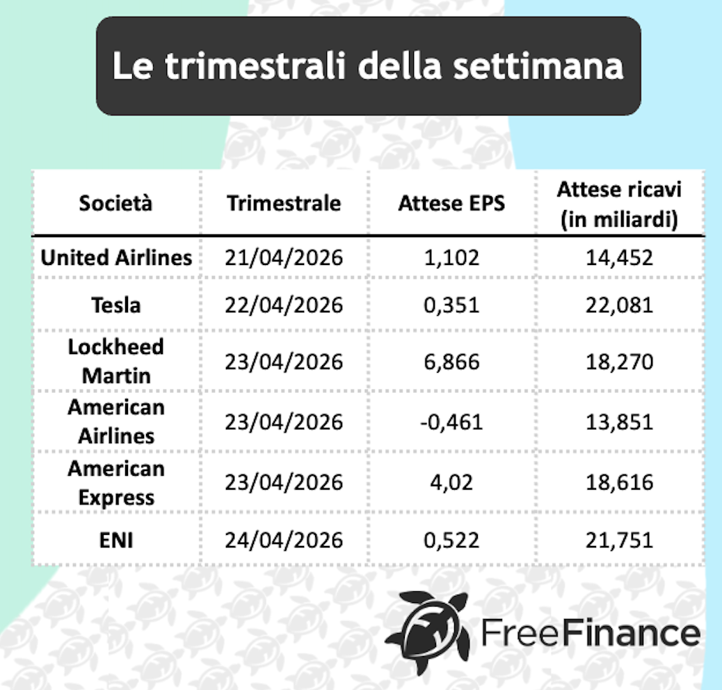 Continua la stagione trimestrali in USA. Ecco le società che monitoriamo più da vicino e che pubblicheranno i conti del 1° trimestre 2026, con le attese Bloomberg per ricavi ed EPS. Il 23 aprile Renault pubblicherà i ricavi del periodo.