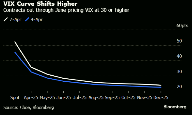 La volatilità potrebbe rimanere elevata per mesi? Secondo la curva dei futures sul VIX mostra che i contratti fino a giugno scambiano intorno a 30, oltre la media decennale di 19 dell’indice spot. Solo una settimana fa ci si trovava intorno a 20.