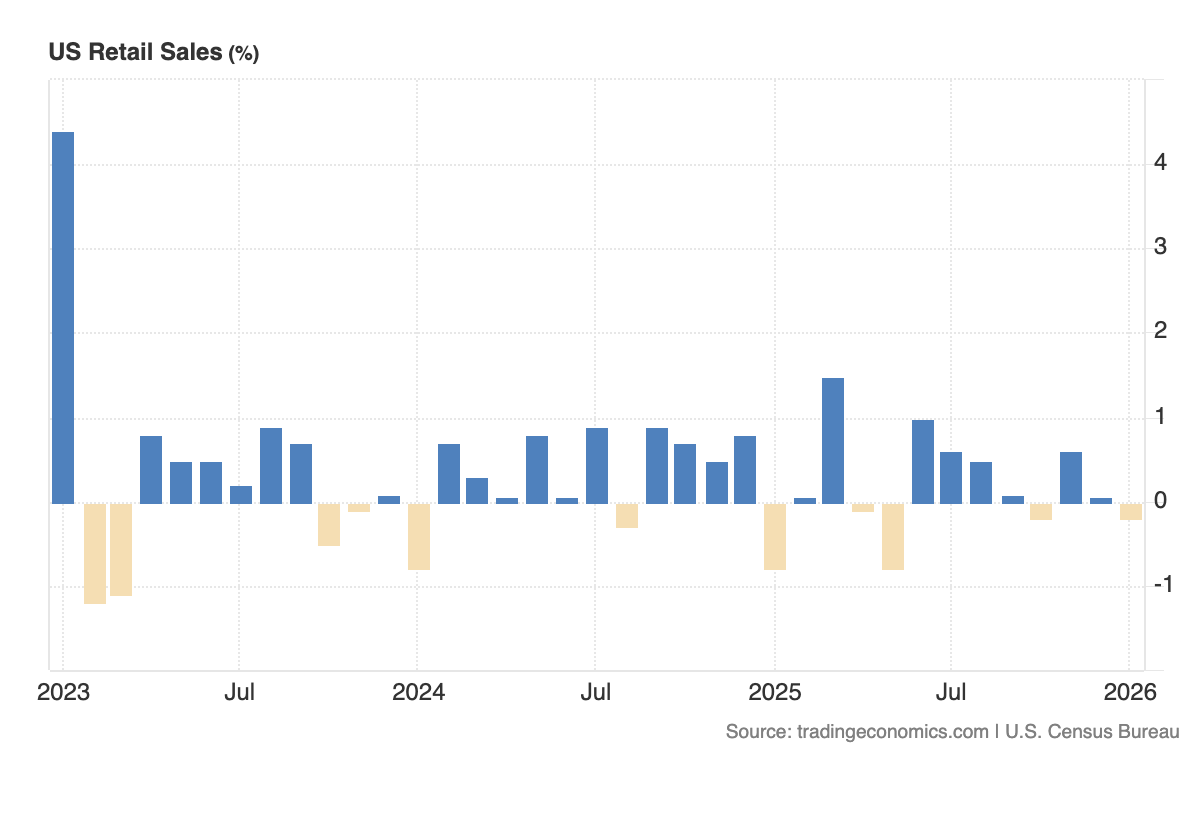 Le vendite al dettaglio USA di gennaio hanno registrato il -0,2%, meglio delle attese Bloomberg al -0,3% e il precedente 0%. Il dato che esclude auto e carburante ha visto un aumento dello 0,3%, oltre le stime allo 0,2% e il precedente 0,1% (rivisto da 0%).